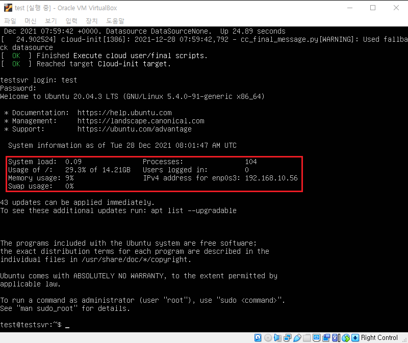 ▼ 리부팅 후 다시 로그인 해보면 IP가 아까 설정한 IP로 바뀐 것이 확인됩니다.