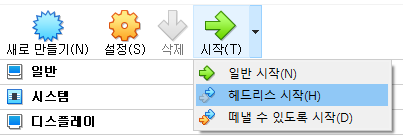 그리고 앞으로는 VirtualBox에서 가상머신을 실행할 때 헤드리스 시작(H)을 누르시면 가상머신 창이 따로 안뜰거예요.