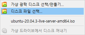 디스크 파일 선택...을 클릭하고 아까 다운로드 받은 우분투 설치 파일을 선택해줍니다.